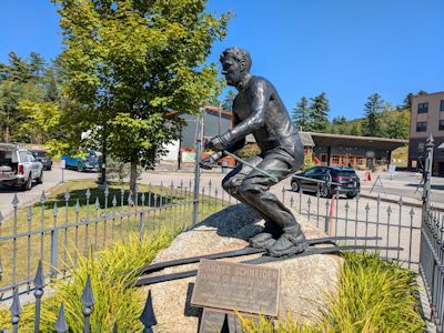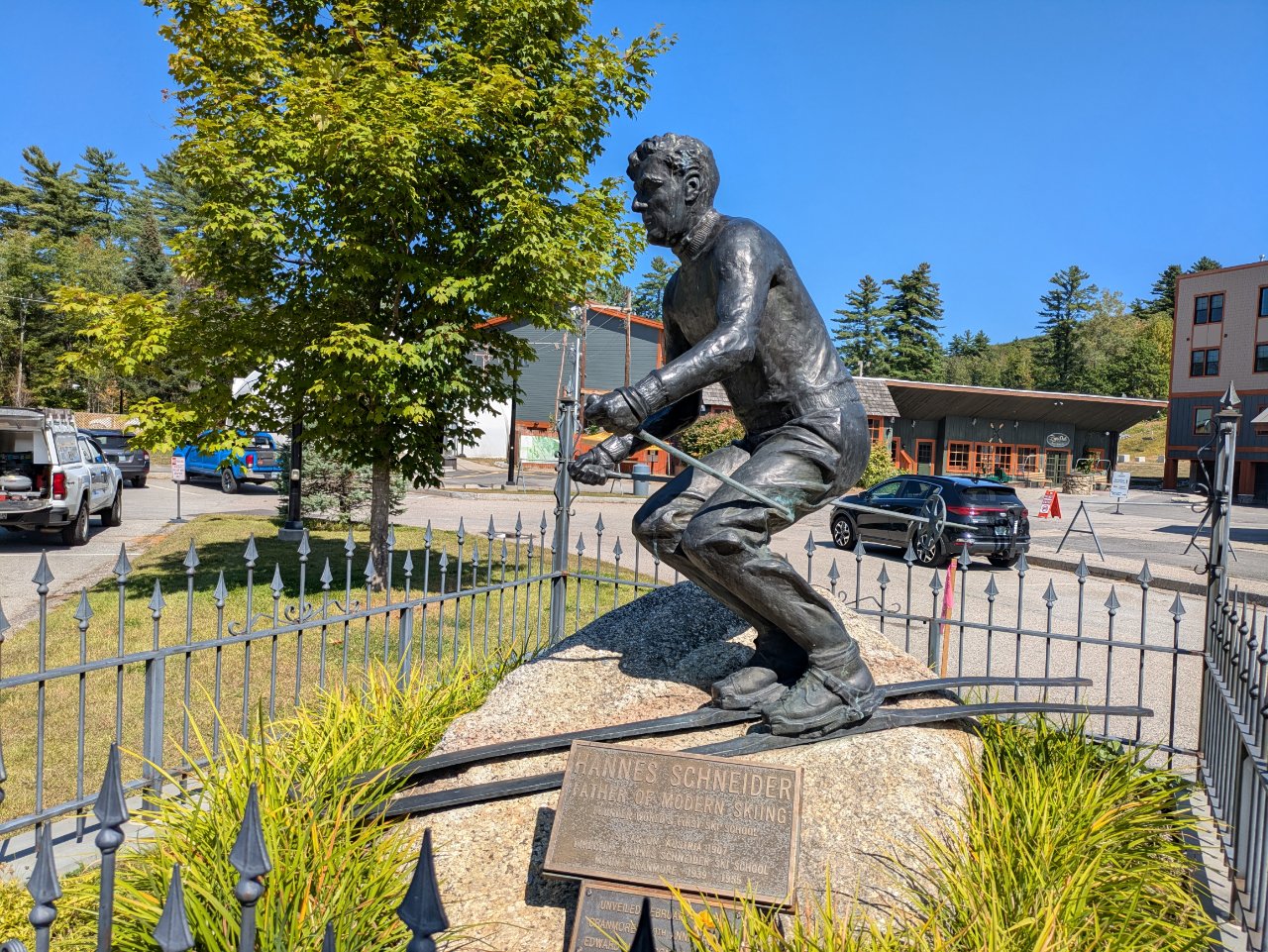 米国クランモアのホテル前に立つシュナイダー像。「近代スキーの父」と書かれている。